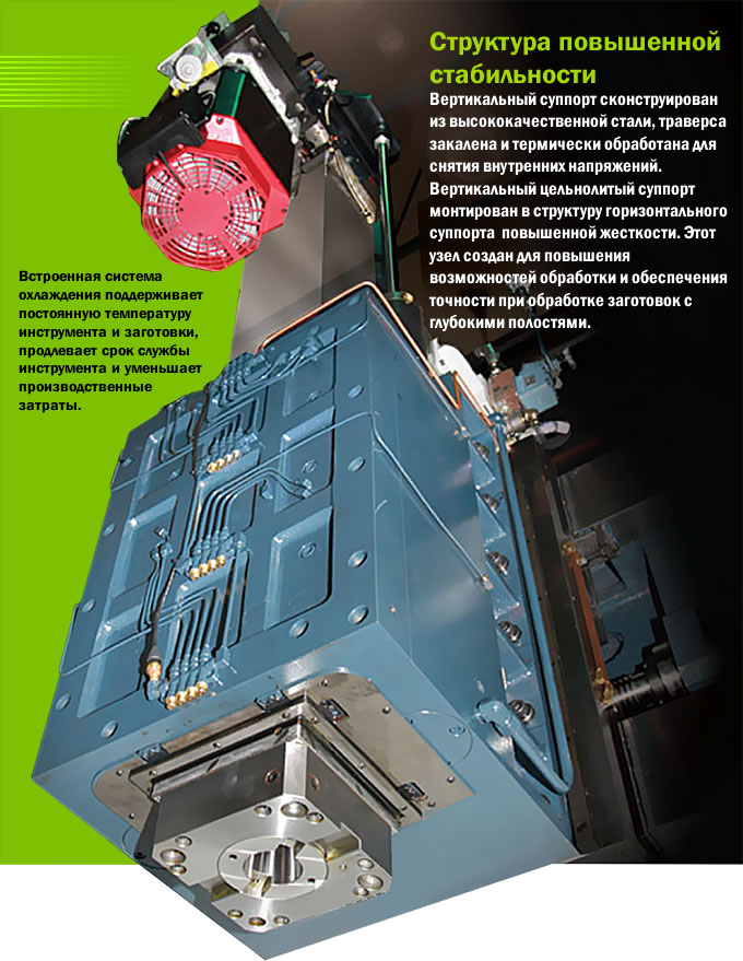 Структура колонны ,большого сечения обеспечивает максимальную поддержку для направляющих траверсы во время процесса обработки. Максимальная степень точности поддерживается также во время непрерывной токарной обработки. |