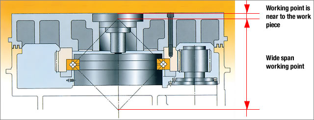 Вертикальный токарный станок спроектирован с использованием подшипников большого диаметра для поворотного стола, для повышенной точности, большой загрузки и повышенной жесткости, необходимой при обработке широких и ассиметричных заготовок.