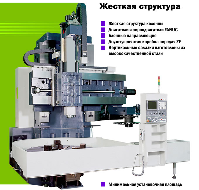 Станок спроектирован с мощным и производительным двигателем шпинделя марки FANUC и немецкой двухступенчатой коробкой передач ZF, развивающей высокий крутящий момент. Это позволяет использовать станок в тяжелых условиях резания и выполнять любые операции, возможные на вертикальном токарном станке.